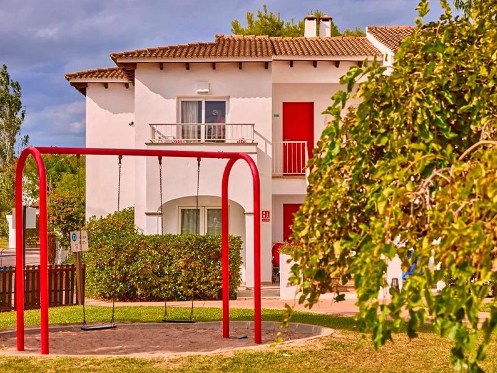 Witte villa's in groene tuinen, Splashzones voor kinderen, Fitnessen en fietsen, Privéterras bij elk appartement, Vier grote buitenzwembaden, Nabij strand van Alcudia & inclusief transfers.